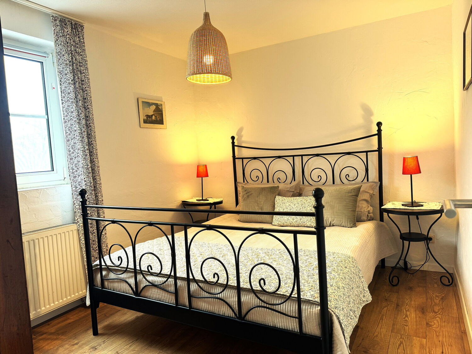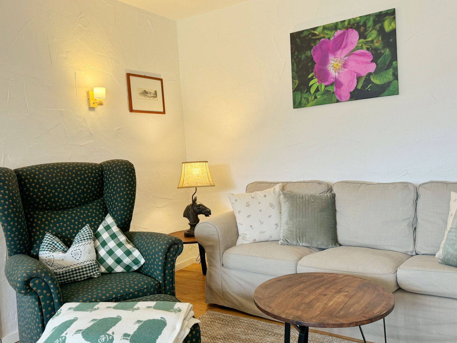 Gemütlich und stilvoll eingerichtet, bietet Dir die Ferienwohnung Wildrose einen wunderschönen Blick in den Obstgarten und auf das Wiesental mit Pferdekoppeln. Eine Terrasse mit Gartenmöbeln und der Obstgarten laden zum Entspannen ein.
